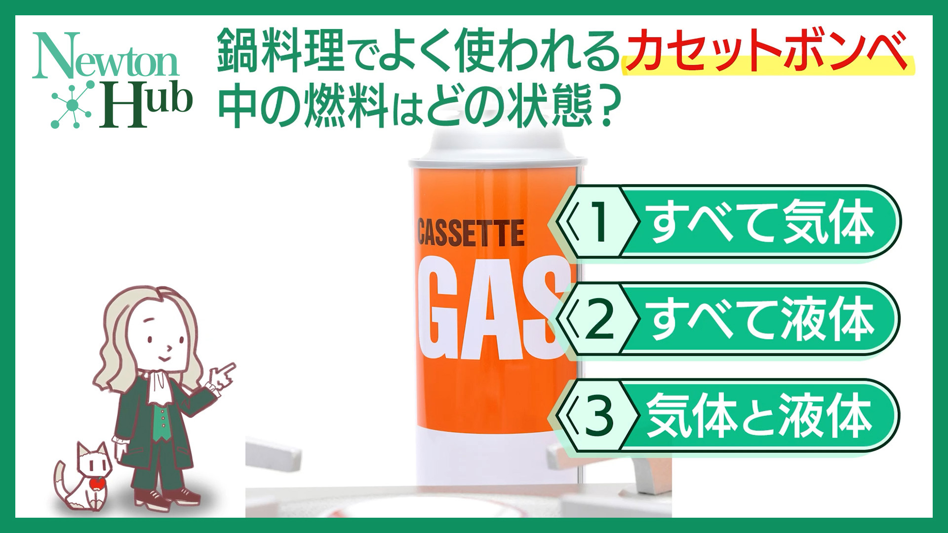 Q.近年、民間旅客機の機体製造に多く使われるようになってきた軽くて丈夫な素材は? 2026.01.30 Read Q.挑戦者はドアを変更すべき? 2026.01.23 Read Q. 書いたものを消せるボールペン その仕組みは? 2026.01.16 Read Q. 氷がとけやすいのはどっち? 2026.01.09 Read Q. 鍋料理でよく使われるカセットボンベ。中の燃料はどの状態? 2026.01.02 Read Q. お米からつくる日本酒と焼酎 違いは何? 2025.12.26 Read Q. 壁とのすき間に強く息を吹きかけるとどうなる? 2025.12.19 Read Q. ノーベル物理学賞をとった発明は? 2025.12.12 Read Q. お風呂に いつ入ると寝つきが良くなりやすい? 2025.12.08 Read Q. 草むらを歩くと服につくことがある「ひっつきむし」。その正体は? 2025.11.28 Read Q. 葉が秋に赤や黄色に変わるのはなぜ? 2025.11.21 Read Q. 食品を冷凍する際、味や食感を保つには? 2025.11.14 Read Q. ネコは猫舌(熱い食べものが苦手)ってホント? 2025.11.07 Read Q. ナタデココの弾力のある食感を生み出している成分は? 2025.10.31 Read Q. 豆電球が光るのはどっち? 2025.10.24 Read Q. コウモリが夜でも飛びまわれるのはなぜ? 2025.10.17 Read Q. 蚊取り線香で45分を測るには? 2025.10.10 Read Q. 電車がガタンゴトンと鳴る音が静かな季節は? 2025.10.03 Read Q. 「タコ」「コバンザメ」「ダンゴウオ」3つの生き物の共通点は? 2025.09.29 Read Q. シリコンバレーの「シリコン」ってなに? 2025.09.19 Read Q. 水素が燃料の「燃料電池」。どうやって発電する? 2025.09.12 Read Q. このなかで光合成をする微生物は? 2025.09.05 Read Q. 月面からは昼間に太陽と一緒に星々が見えるのに、地球上からは昼間に星が見えないのはなぜ? 2025.08.29 Read Q. ヤモリが壁や天井にはりつくことができるのはなぜ? 2025.08.22 Read Q. ひだりに回転をかけてボールを投げると、ボールはどっちに飛んでいく? 2025.08.15 Read 原子の並び方が違うだけで、鉛筆の芯やダイヤモンドになる元素は? 2025.08.08 Read 70℃の湯を霧吹きで手にかけるとどう感じる? 2025.08.01 Read 0°C以下の水をつくるにはどうする? 2025.07.25 Read 一般的なLED照明と蛍光灯、 虫が近寄りにくいのはどっち? 2025.07.18 Read 高い山で水は何°Cで沸騰する? 2025.07.11 Read ヒトの涙は弱酸性?弱アルカリ性? 2025.07.04 Read 鍋が吹きこぼれると、炎の色が黄色に変わる理由は? 2025.06.27 Read 地殻(地球の表層)に2番目に多く存在する元素は? 2025.06.20 Read 雨粒が落下するときの形状は? 2025.06.13 Read 同じ電車内に50人いる場合、同じ誕生日の人がいる確率は? 2025.06.06 Read 「デザートは別腹」の"別腹"ってホント? 2025.05.31 Read 月はなぜ地球に落ちてこない? 2025.05.23 Read 蛇口から流れる水に、ティッシュでこすったストローを近づけると水流はどうなる? 2025.05.19 Read 北極と赤道 行くと体重が軽くなるのはどっち? 2025.05.12 Read